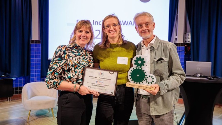 Op dinsdag 28 oktober werden de winnaars van de ECIO Inclusie Award 2025 bekendgemaakt. Voor het eerst was er ook een publieksprijs. Die ging overtuigend naar de StudieHUiskamer van Hogeschool Utrecht. De StudieHUiskamer biedt studenten die moeite hebben met studeren een vaste plek en een vast moment om samen met anderen te studeren, met hulp van een coach of begeleider. Studenten schreven vaak: ‘Zonder dit had ik het niet gered.’ |
